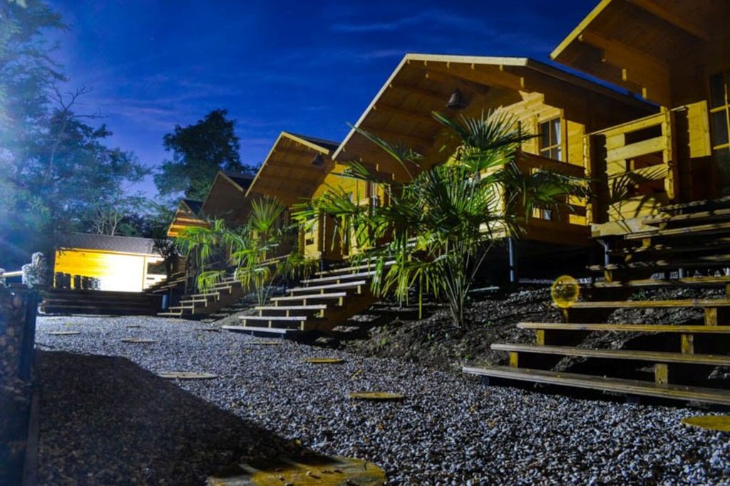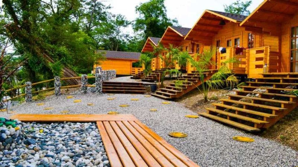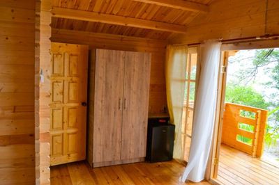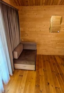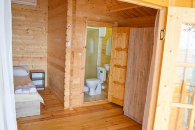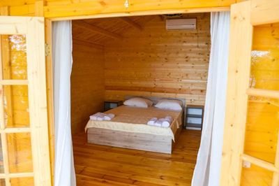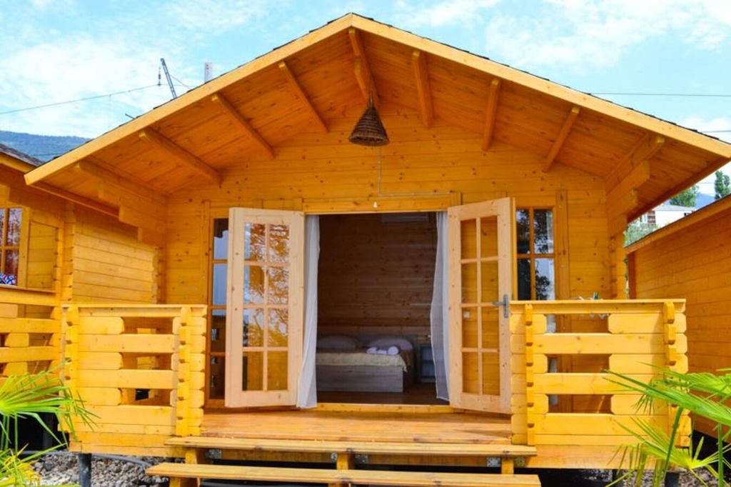 Во всех домиках имеется двуспальная кровать, кресло-кровать, шкаф, стулья, прикроватные тумбочки, вешалка, зеркало.